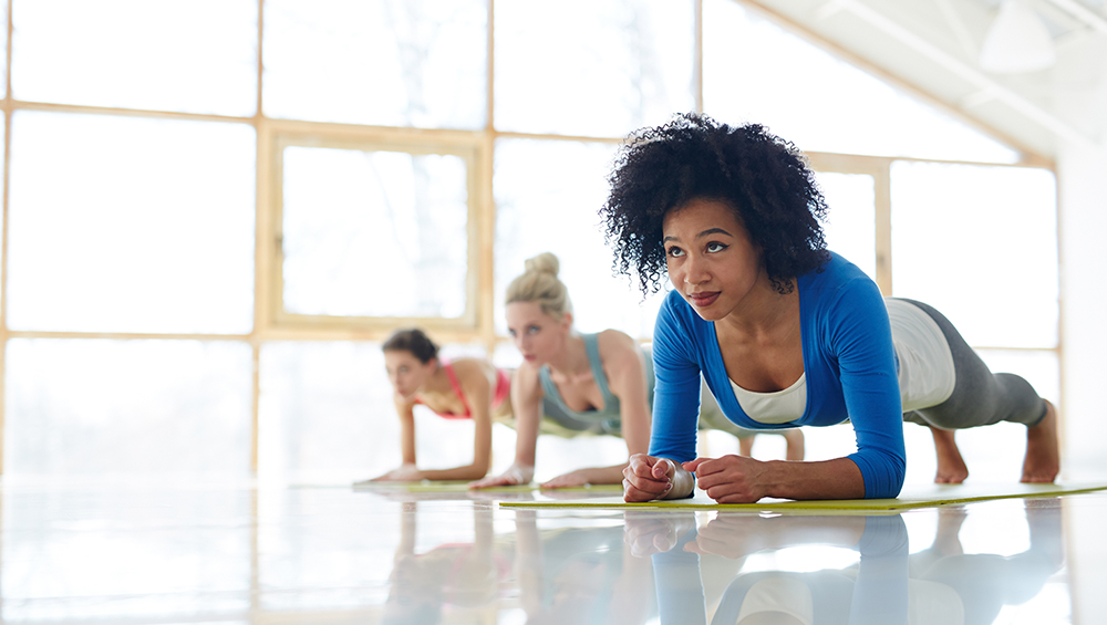 Get down on your forearms and extend your legs so your body is in line from your head to your heels. Keep your abs tight. Hold for 10 to 15 seconds and repeat four to six times for a total of 60 seconds. As you get stronger, hold the plank longer for fewer reps, working up to holding it for a full 60 seconds.