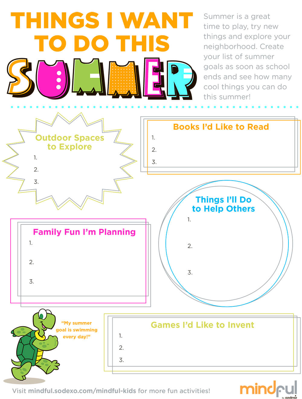 TJ the Turtle here! I love having free time each  to meet up with my pals to have fun. Each, I think about the things I want to learn, the books I want to read and the places I’d like to go. By writing down my goals, I know I can accomplish them! Use our fun worksheet to set your own goals and see how many things you can finish during vacation!