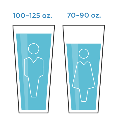Think that eight glasses of water a day is enough? Think again. “Women need 70 to 90 ounces of liquid a day, while men need 100 to 125 ounces,” says Bonci.That puts eight glasses (64 ounces) at the low end of the hydration spectrum. To get a better idea of your needs, use the Mindful Hydration Calculator. If you exercise, you’ll need to increase that total. The general rule is to drink four to eight ounces of liquid for every 20 minutes you exercise.