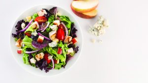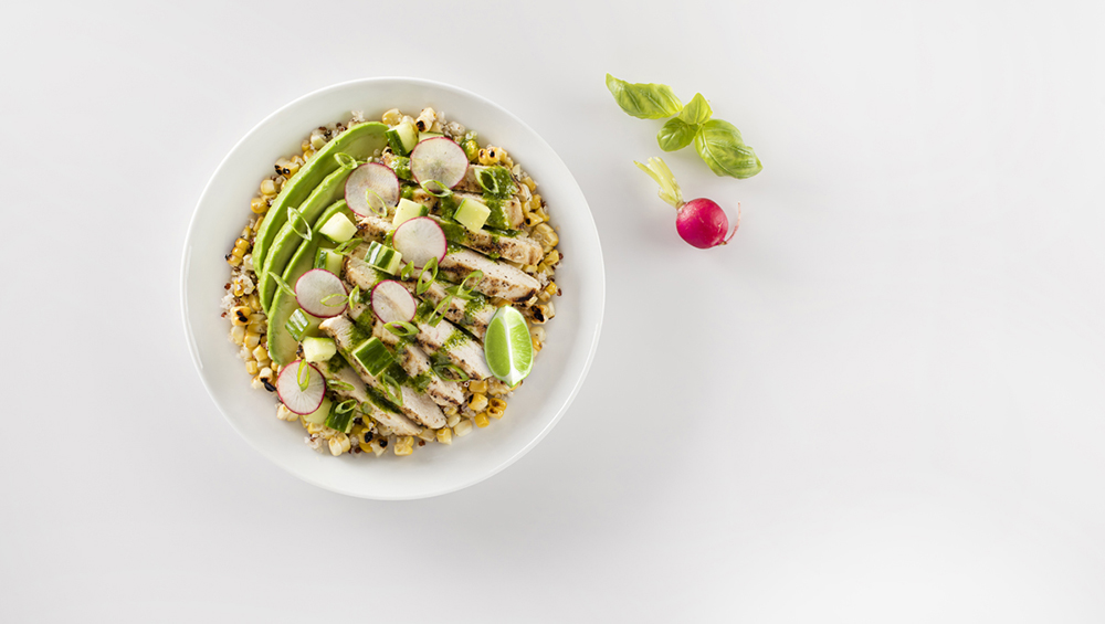 Corn and quinoa topped with grilled chicken, cucumber, radish and avocado with a drizzle of dressing and green onions