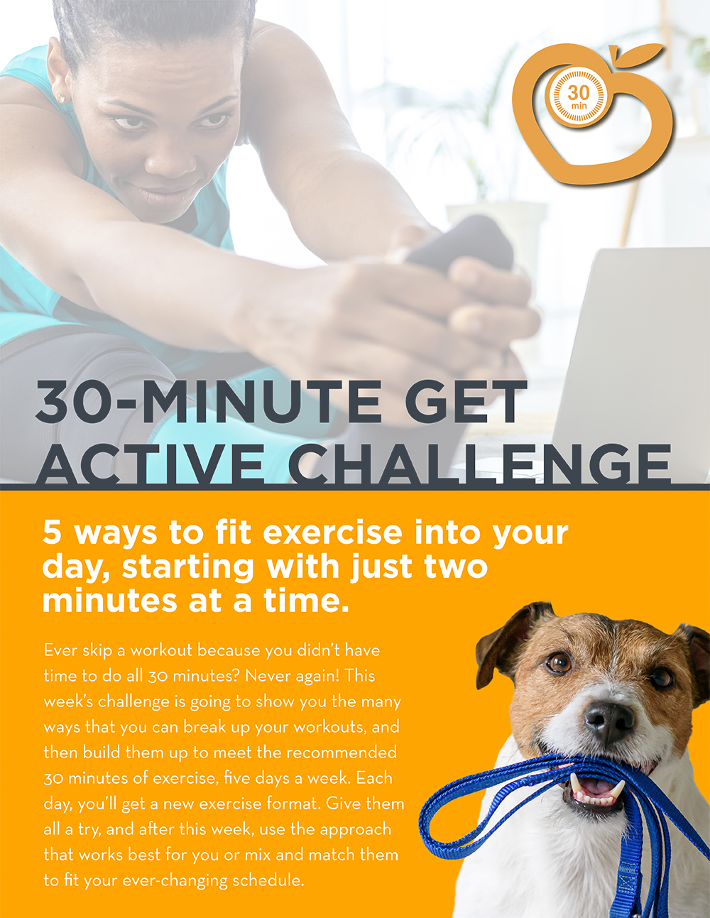 If you have a little extra time to exercise, then you don’t have to do as many bouts throughout the day. So today, look for five-minute slots to fit in activity and do that six times to hit your 30-minute exercise goal. Here are ideas for how to fit them in: