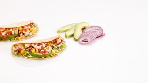 Tortilla garni de courgettes grillées, hummus, poivrons rouge, bébés épinards, oignons rouges et épices Dukkah.