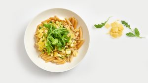 - 2. Schil de zoete aardappel en snijd deze in stukken. Meng de zoete aardappel met 1/3 van de olie en de peper en grill deze ca. 15 minuten in de oven.