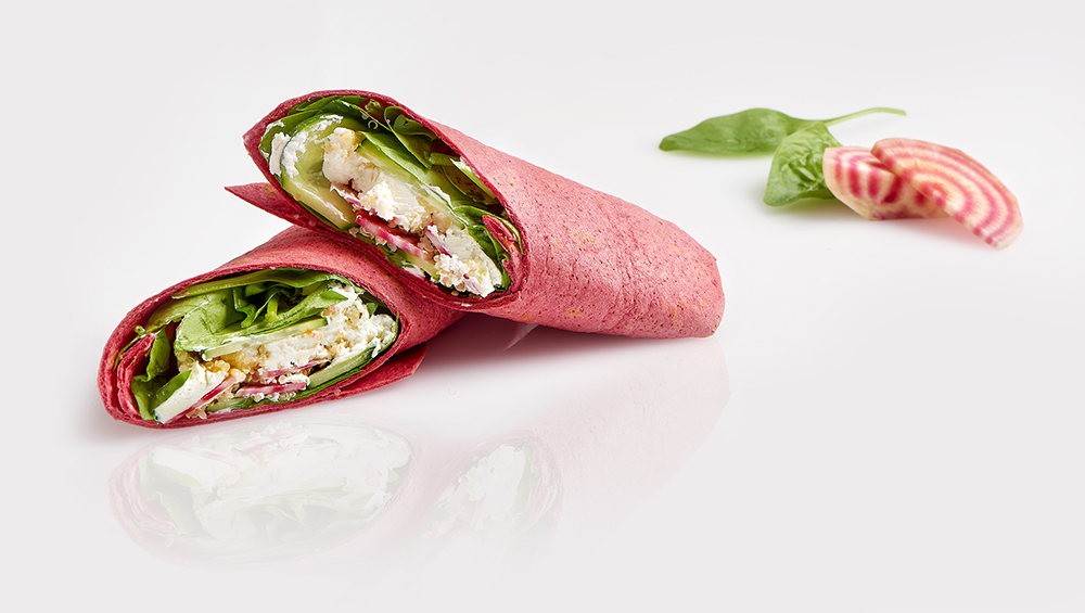 - 3. Beleg de tortilla met de spinazie, verbrokkel de geitenkaas erover en beleg met de komkommer, de bieten en de quinoa. Rol de tortilla op en snijd deze schuin door. Serveer 2 halve wraps per portie.