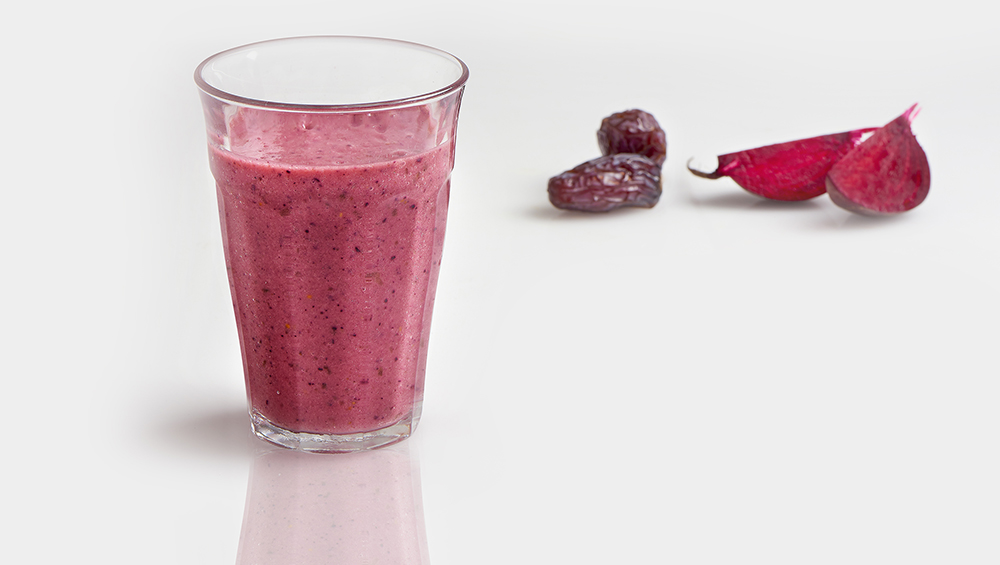 - 2. Doe de bosvruchten, de banaan, de dadels, de bietenblokjes en de sojadrink in de blender en pureer dit tot een gladde smoothie.