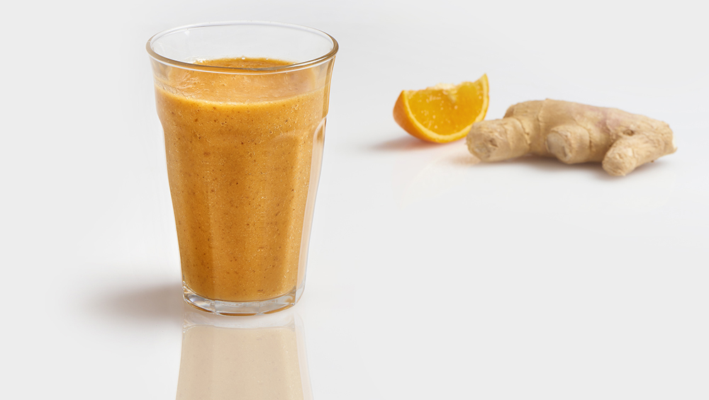Smoothie van sinaasappel, banaan en wortelsap met gember en dadels.